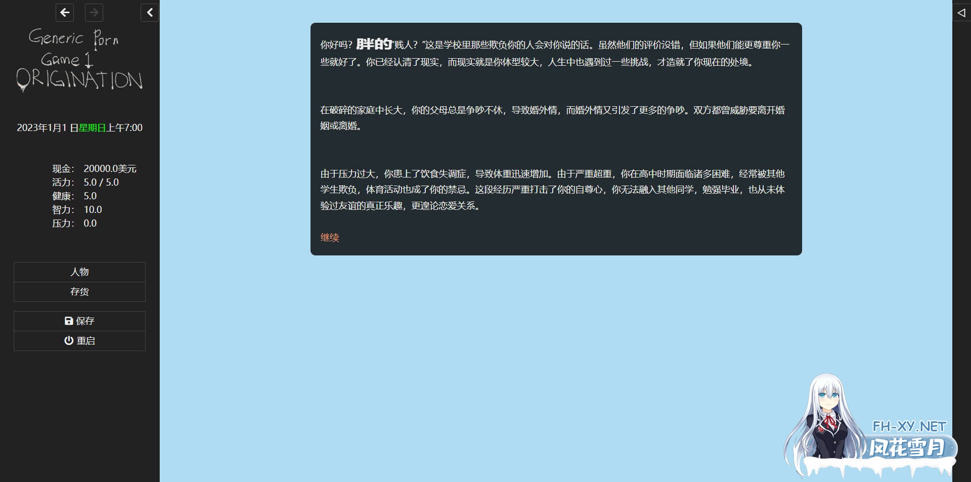 游戏介绍 你将扮演一名男杏角色,获得重新开始的机会。 你如何与周围的世界互动完全取决于你(也取决于我)。 游戏中 ...